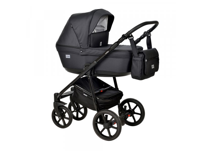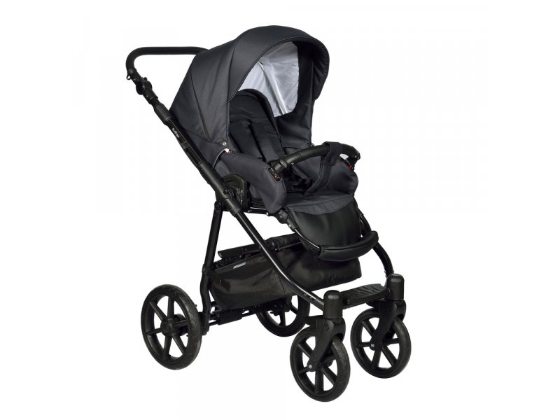 Шасси: Рама коляски изготовлена из алюминия, вес коляски с люлькой составляет чуть больше 13 кг. Регулируемую кожаную ручку легко настроить под свой рост, так что гулять с коляской будет удобно любому члену семьи независимо от роста. Передние поворотные колеса делают коляску маневренной и легкой в управлении, ну а если нужно повысить проходимость – фиксируем колеса и смело отправляемся преодолевать препятствие. Бескамерные износостойкие колеса из полиуретана не боятся проколов и не требуют подкачки. Плавность хода обеспечат регулируемые пружинные амортизаторы и система AntiShok на передних колесах. Задние колеса устанавливаются с использованием системы выдвижных осей. Благодаря ей сложенная рама со снятыми колесами будет занимать меньше места и, самое главное, торчащие оси не поцарапают багажник автомобиля. Ширина колесной базы задних колес – 59 см. Коляска без труда заедет в обычный лифт или поднимется по стандартному пандусу