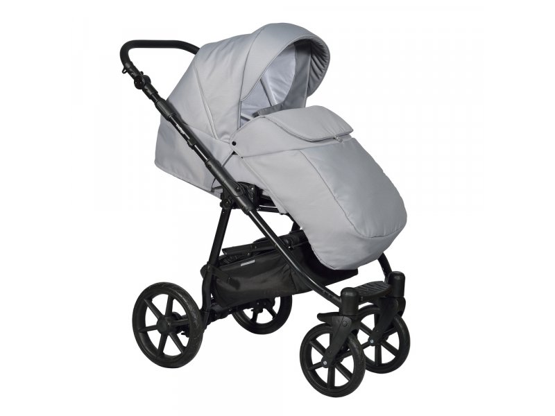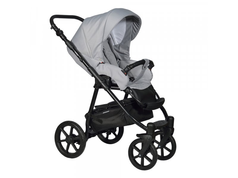 Шасси: Рама коляски изготовлена из алюминия, вес коляски с люлькой составляет чуть больше 13 кг. Регулируемую кожаную ручку легко настроить под свой рост, так что гулять с коляской будет удобно любому члену семьи независимо от роста. Передние поворотные колеса делают коляску маневренной и легкой в управлении, ну а если нужно повысить проходимость – фиксируем колеса и смело отправляемся преодолевать препятствие. Бескамерные износостойкие колеса из полиуретана не боятся проколов и не требуют подкачки. Плавность хода обеспечат регулируемые пружинные амортизаторы и система AntiShok на передних колесах. Задние колеса устанавливаются с использованием системы выдвижных осей. Благодаря ей сложенная рама со снятыми колесами будет занимать меньше места и, самое главное, торчащие оси не поцарапают багажник автомобиля. Ширина колесной базы задних колес – 59 см. Коляска без труда заедет в обычный лифт или поднимется по стандартному пандусу