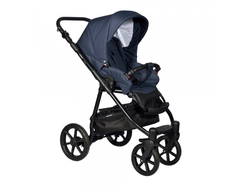 Шасси: Рама коляски изготовлена из алюминия, вес коляски с люлькой составляет чуть больше 13 кг. Регулируемую кожаную ручку легко настроить под свой рост, так что гулять с коляской будет удобно любому члену семьи независимо от роста. Передние поворотные колеса делают коляску маневренной и легкой в управлении, ну а если нужно повысить проходимость – фиксируем колеса и смело отправляемся преодолевать препятствие. Бескамерные износостойкие колеса из полиуретана не боятся проколов и не требуют подкачки. Плавность хода обеспечат регулируемые пружинные амортизаторы и система AntiShok на передних колесах. Задние колеса устанавливаются с использованием системы выдвижных осей. Благодаря ей сложенная рама со снятыми колесами будет занимать меньше места и, самое главное, торчащие оси не поцарапают багажник автомобиля. Ширина колесной базы задних колес – 59 см. Коляска без труда заедет в обычный лифт или поднимется по стандартному пандусу