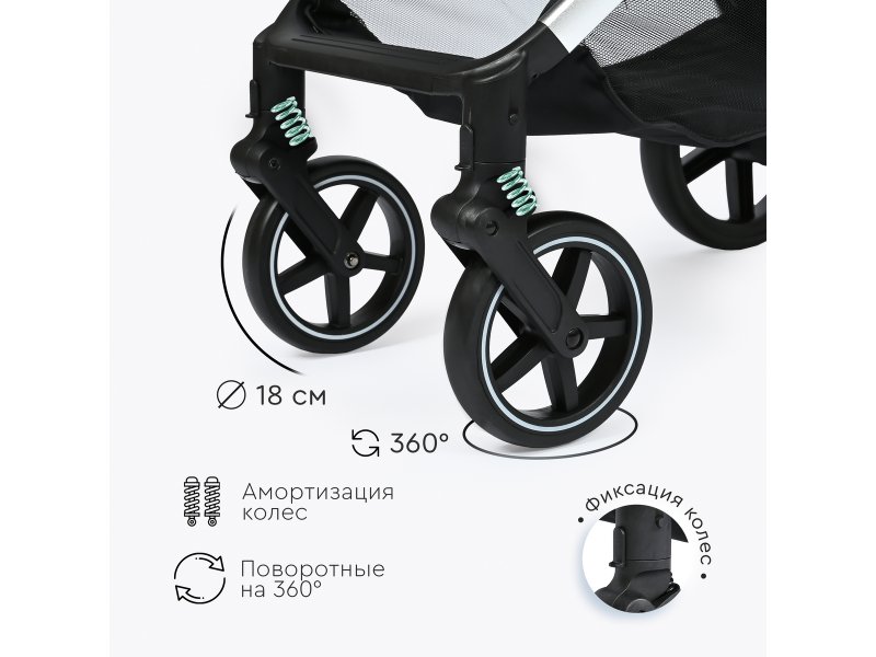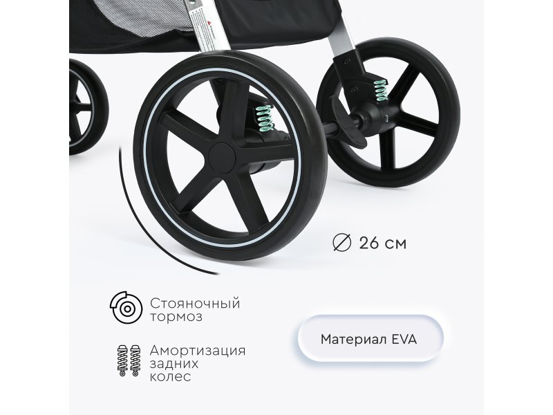 Амортизация передних и задних колес обеспечивает плавный ход коляски.