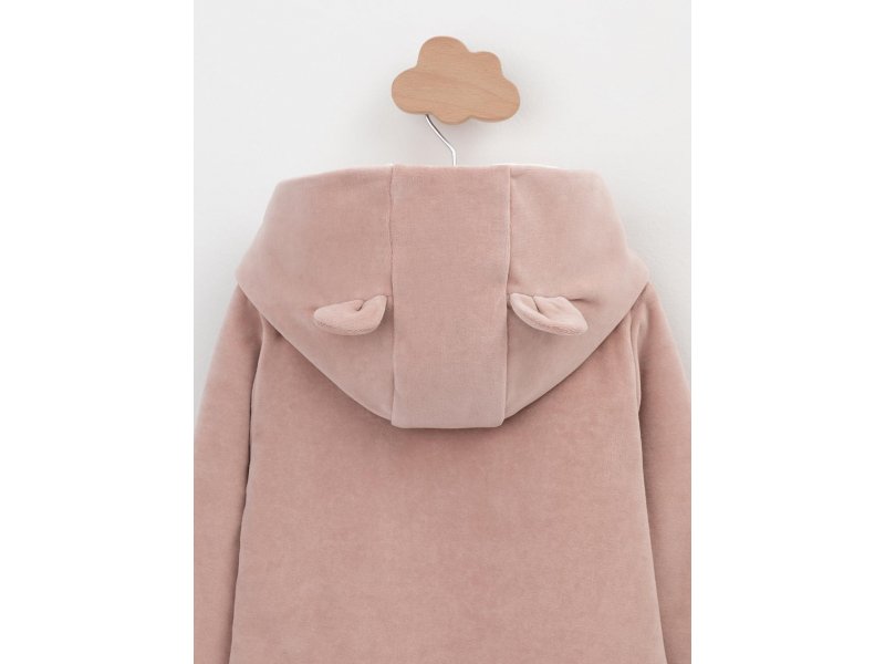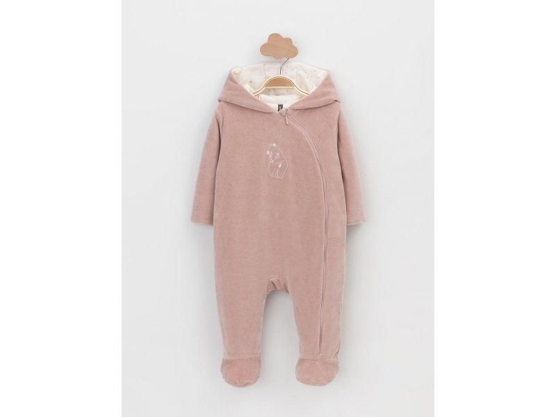 Тёплый комбинезон из велюра для новорождённых. Внутри синтепон и подклад из натурального хлопка. Изделие застёгивается на молнию и имеет капюшон. В размерах 80 и 86 на ножках манжеты. Все трикотажные полотна производятся в соответствии с нормами Швейцарского сертификата ЭкоТекс.