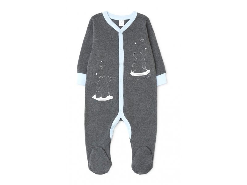 Комбинезон для мальчика из мягкого трикотажа интерлок с закрытыми ножками. Украшен принтами с изображением медвежат. Застёгивается по центру на кнопки. На рукавах - эластичные манжеты.