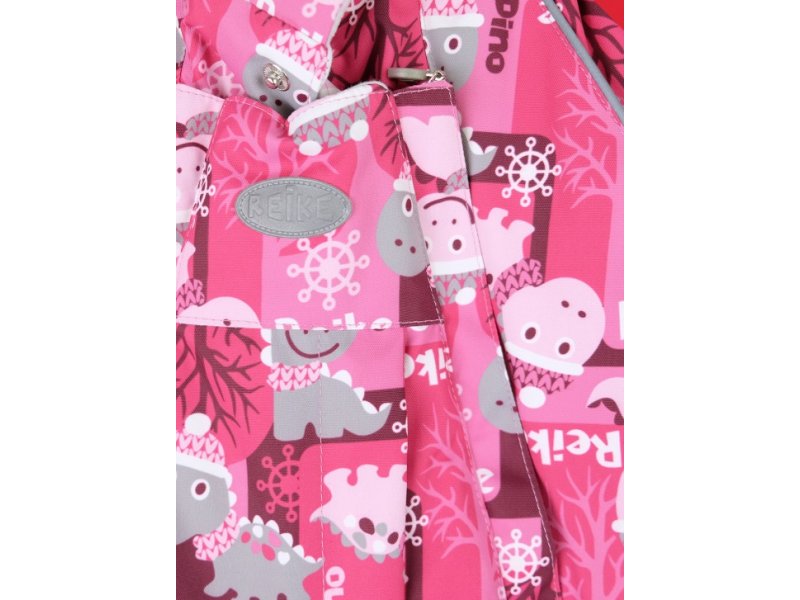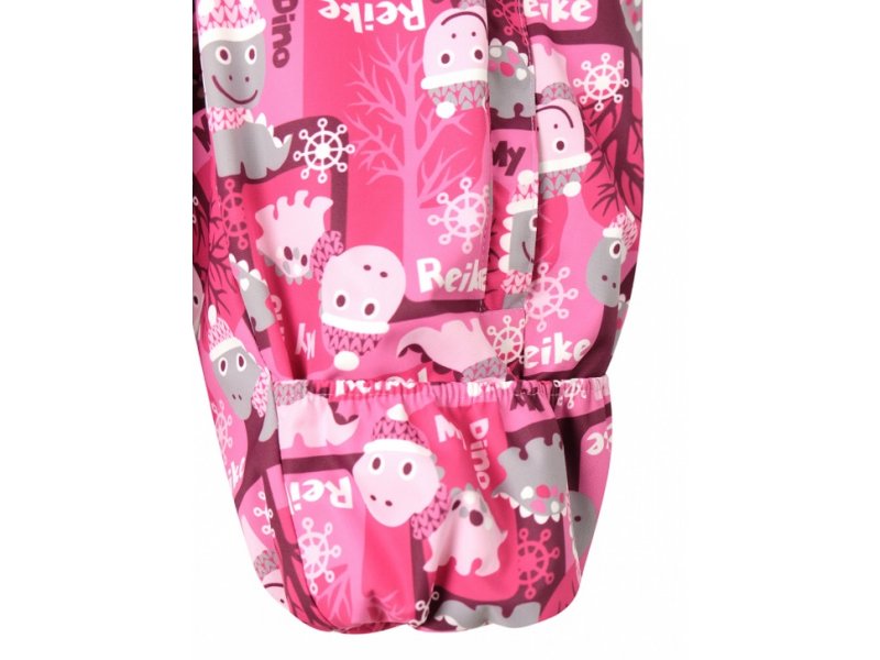 Комбинезон детский Reike Dino в насыщенном оттенке фуксия выполнен из ветрозащитной, водоотталкивающей и дышащей мембранной ткани, декорированной принтом с динозаврами. Хлопковая подкладка с велюровыми вставками на воротнике и в рукавах обеспечивает малышу дополнительный комфорт и тепло. В рукавах для удобства надевания в качестве подкладки используется гладкий полиэстер. Комбинезон застегивается на две вертикальные молнии, обеспечивая легкое переодевание малыша. Сзади на талии комбинезон присборен на резинку. Капюшон оформлен резинкой для надежной фиксации на голове ребенка. Комбинезон дополнен кармашком на молнии, светоотражающими деталями на груди и спинке.