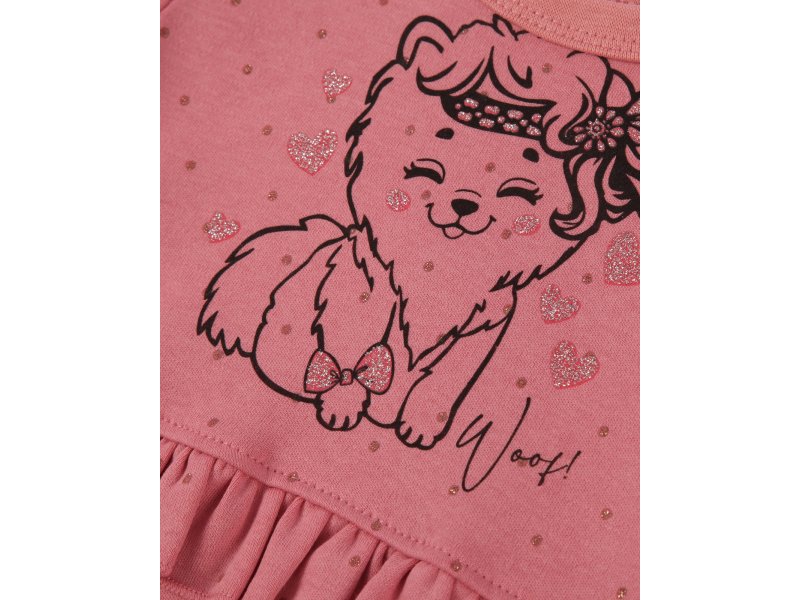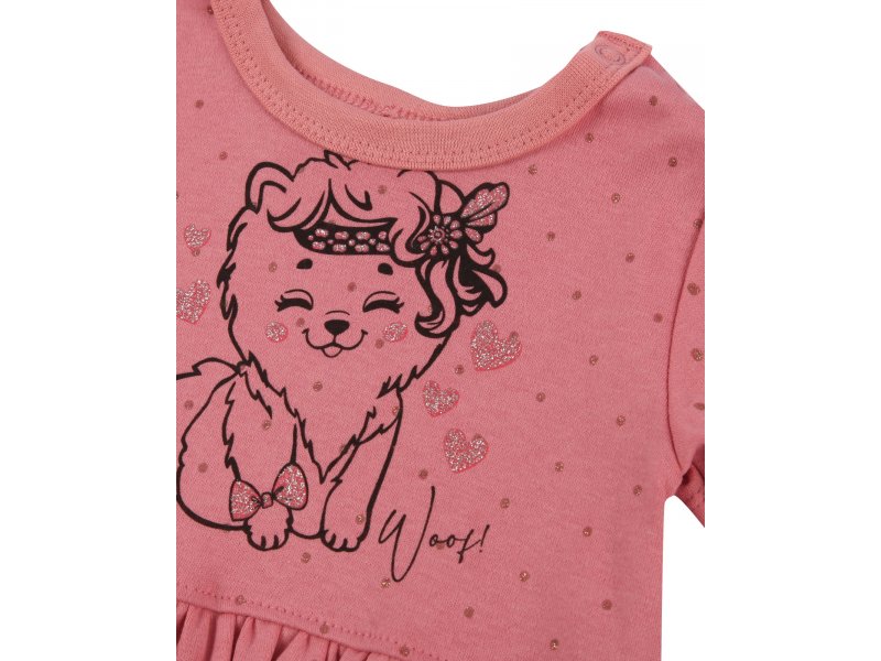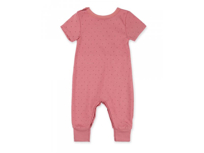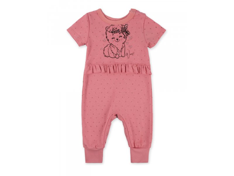 Полукомбинезон. Короткий рукав. Украшен рюшкой на поясе. Ткань интерлок. Застежки кнопки на плечике и между ножек. Ножки открыты с отделкой из рибаны.
