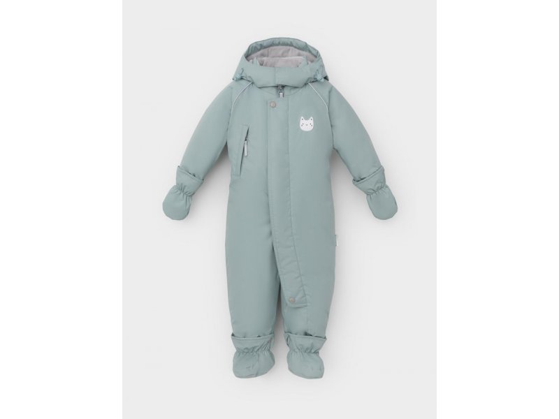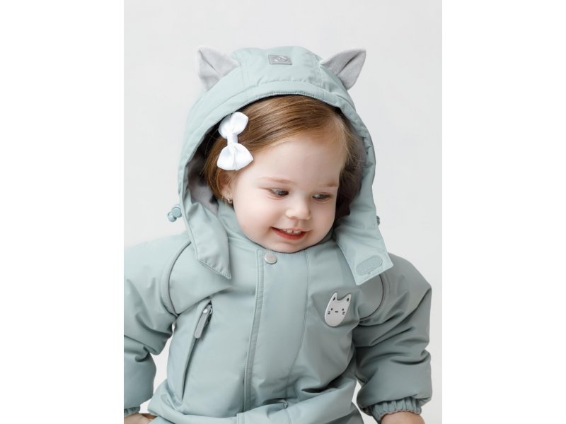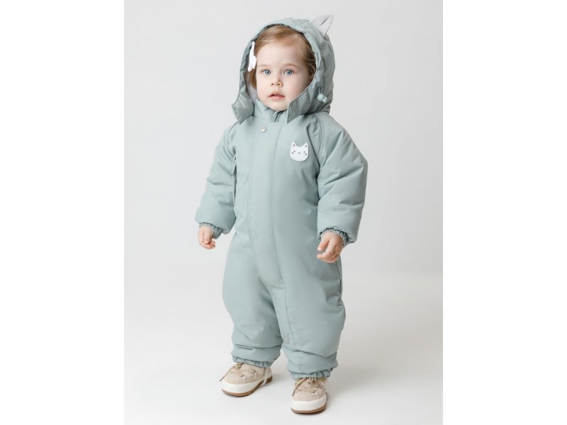 Комбинезон застёгивается на молнию и внешнюю планку на липучках, предусмотрена защита подбородка. Несъёмный капюшон с подкладом из мягкого флиса имеет эластичную утяжку со стопперами и декоративные ушки. Резинка по спинке для лучшего прилегания. На груди карман на молнии. По рукавам и низу изделия эластичные манжеты, на ножках отстёгивающиеся силиконовые штрипки.