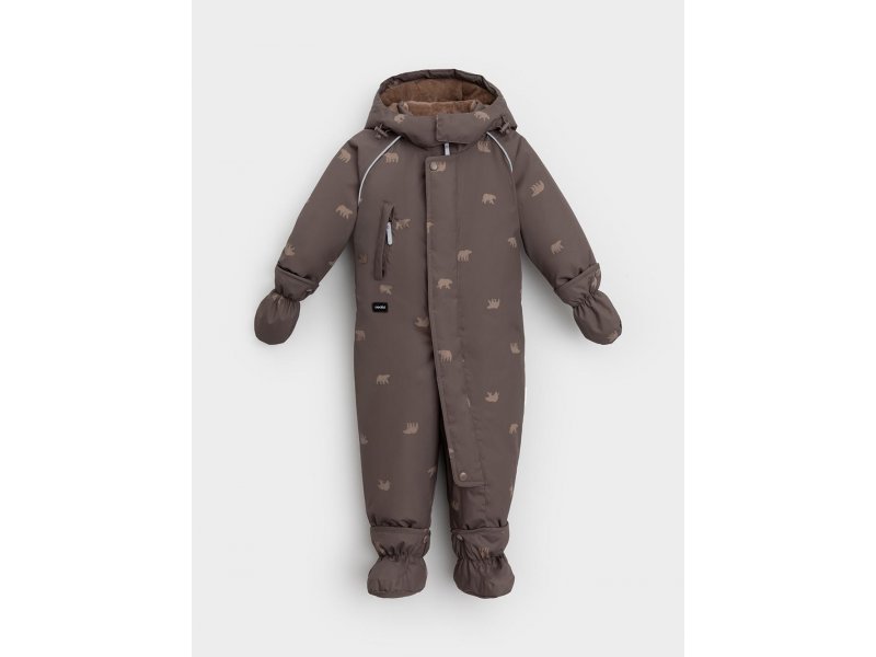 Комбинезон застёгивается на молнию и внешнюю планку на липучках, предусмотрена защита подбородка. Несъёмный капюшон имеет эластичную утяжку со стопперами. Резинка по спинке для лучшего прилегания.