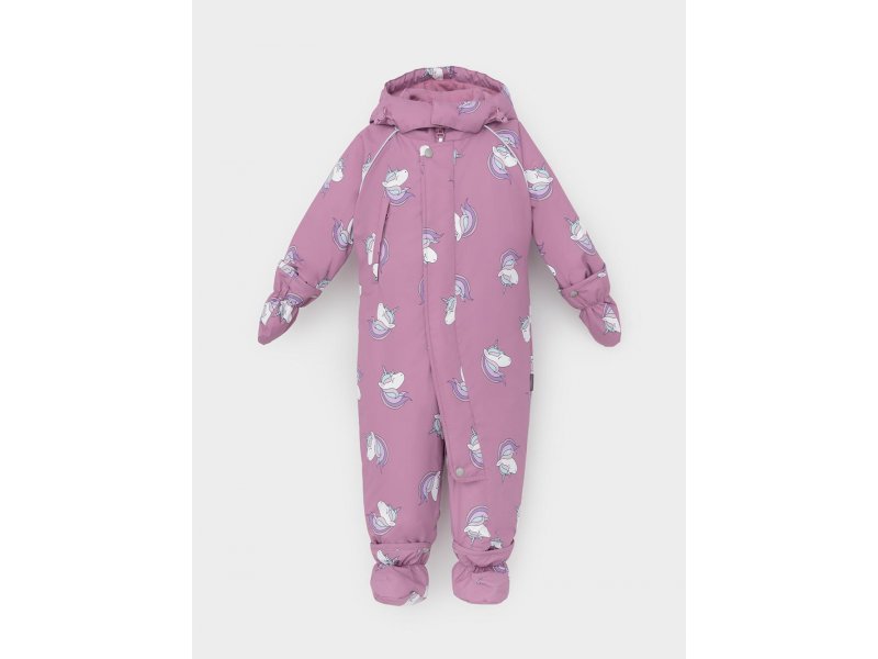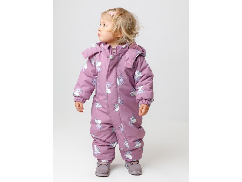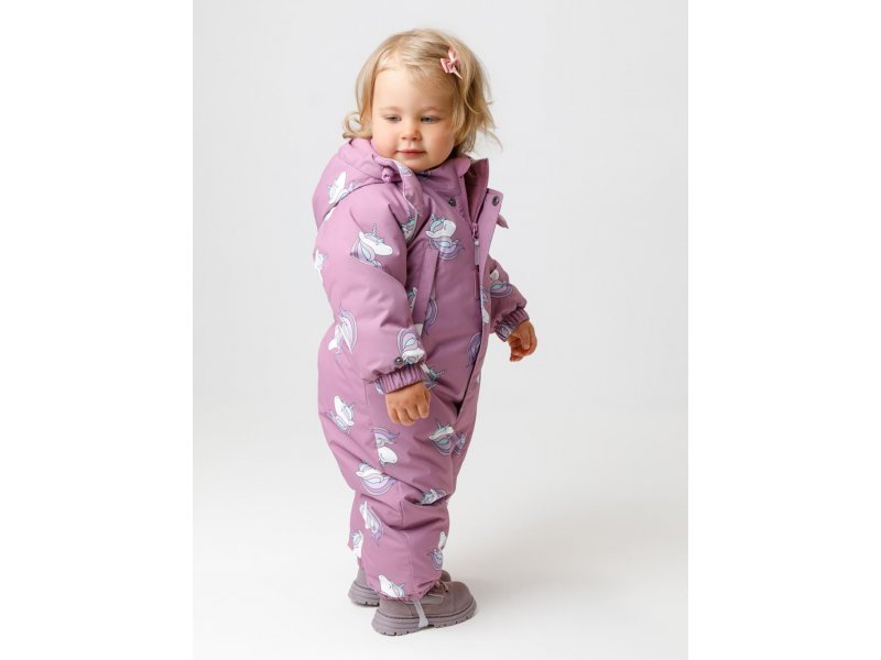 Комбинезон застёгивается на молнию и внешнюю планку на липучках, предусмотрена защита подбородка. Несъёмный капюшон с подкладом из мягкого флиса имеет эластичную утяжку со стопперами и декоративные ушки. Резинка по спинке для лучшего прилегания. На груди карман на молнии. По рукавам и низу изделия эластичные манжеты, на ножках отстёгивающиеся силиконовые штрипки.