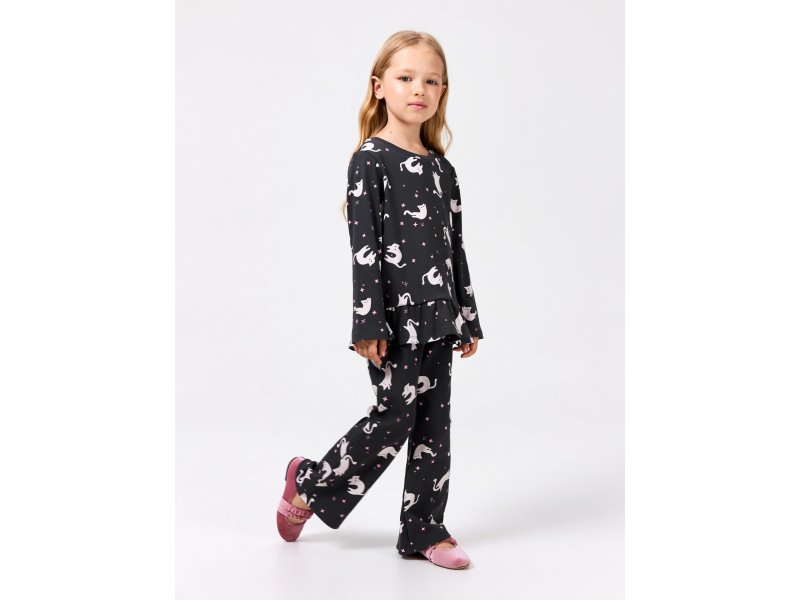 Детский комплект с брюками для девочки — это стильный и уютный сет для создания повседневного или домашнего образа. Он изготовлен из декоративной рибовой ткани с рисунком котиков. Брюки на широкой эластичной резинке в поясе обещает комфортную посадку на разные типы фигур. Брюки полной длины и прямого силуэта. Джемпер удлиненного кроя со стандартной линией плеча украшен пышной баской по низу, придающей стильный и нежный акцент всему образу. Комплект выполнен из эластичного риба с принтом в виде котиков, который порадует юную мечтательницу. Набор подойдет для повседневного ношения или же станет любимой домашней одеждой.