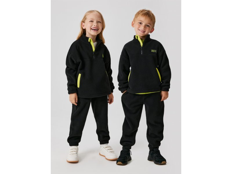 Детский унисекс комплект состоит из брюк и джемпера. Изделия выполнены из легкого флиса, который приятно сохраняет тепло и быстро сохнет. Спереди джемпера расположена планка с застежкой на молнию, что облегчает одевание; внутри планки располагается контрастная отделка. Воротник-стойка избавляет от необходимости носить шарф. Рукава джемпера и брюки по низу дополнены манжетами на резинке, которые обеспечивают лучшее прилегание к телу и сохранение тепла. Брюки с поясом на резинке создают комфортную посадку по фигуре. По бокам модели расположены карманы с контрастными листочками, что позволяет хранить необходимые мелочи. Комплект из брюк и джемпера – это универсальный вариант для мальчиков и для девочек для создания теплого повседневного образа.