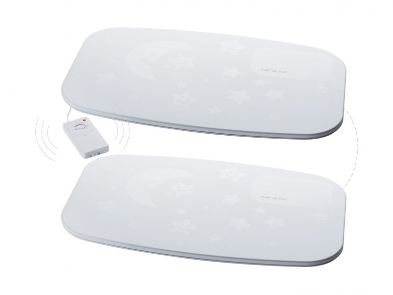 В комплект включены два монитора дыхания (SP200 и SP100), которые при необходимости могут быть отключены друг от друга. Монитор дыхания Ramili SP200 оснащен блоком управления, с помощью которого можно настроить чувствительность сенсоров. Модель Ramili SP100 является дополнительным блоком, который вдвое увеличивает площадь покрытия датчиков системы. Оба блока работают от батареек, которые помещаются в блок управления, а продолжительность непрерывной работы от трех батареек составляет приблизительно 7 дней и зависит от используемых элементов питания. Монитор дыхания Ramili® Movement Sensor Pad представляет из себя коврик, который располагается под матрасиком в детской кроватке. Коврик оснащен высокочувствительными сенсорами, которые контролируют движение, вызываемое дыханием ребенка во время сна. Если причин для тревоги нет (естественный ритм дыхания), то на мониторе радионяни Ramili отображается соответствующая анимация. Если обнаружен необычный ритм дыхания или его отсутствие, то радионяня подает родителям визуальный и звуковой сигнал тревоги. Монитор дыхания Ramili Movement Sensor Pad не предназначен для автономной работы, а является дополнительной опцией для радионяни Ramili Baby, поддерживающей подключение монитора дыхания из серии SP.