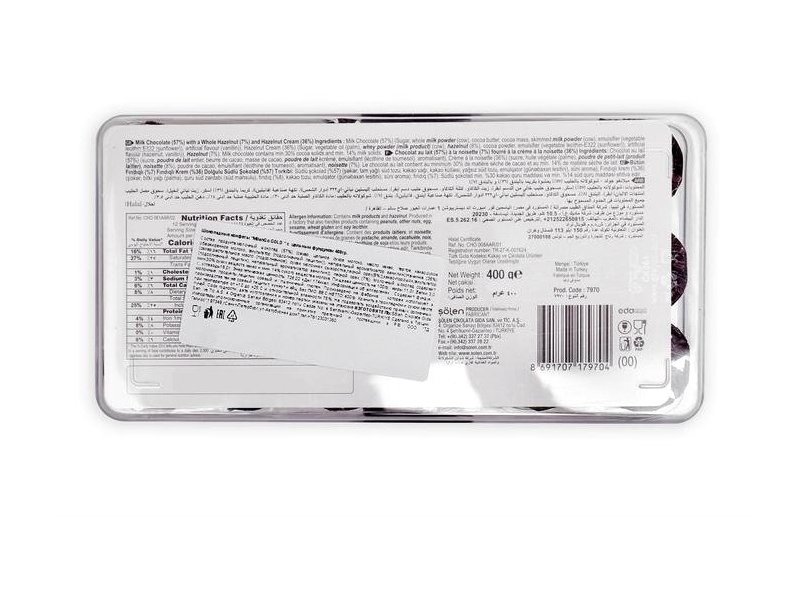 Состав: Молочный шоколад (57%) с цельным фундуком (7%) и начинкой из лесных орехов (36%) Ингредиенты: молочный шоколад (57%) (сахар, цельное сухое молоко, масло какао, какао тертое, сухое обезжиренное молоко), эмульгатор (подсолнечный лецитин), натуральный ароматизатор (ванилин)), начинка из лесного ореха (36%) (сахар, растительное масло (подсолнечное), сухая молочная сыворотка), фундук (8%) , какао-порошок, эмульгатор (подсолнечный лецитин), натуральный ароматизатор (ванилин)), лесной орех (7%).