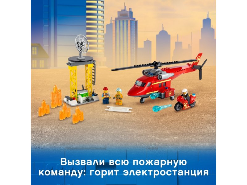 Конструктор Lego City Fire Спасательный пожарный вертолёт. Тревога! Горит электростанция! Присоединяйтесь к пилоту-пожарному из сериала «ЛЕГО Сити: приключения» Клеммонсу и потушите пожар в промышленном комплексе. Отправляйте пожарный мотоцикл, загрузите носилки и поднимайте по тревоге спасательный пожарный вертолёт. Помогите Клеммонсу управиться со шлангом, установить вертолёт в нужное положение и использовать мощные водомёты, чтобы погасить пламя наверху башни!