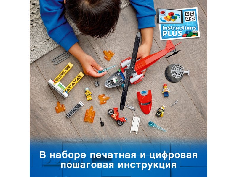 - Дети могут складывать языки пламени LEGO для большого пожара, расстреливать их из водяных пушек вертолёта, чтобы потушить огонь, и придумывать собственные сюжеты для шоу «ЛЕГО Сити: приключения» с тремя мини-фигурками.