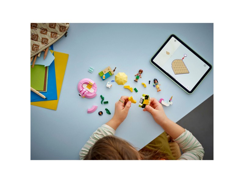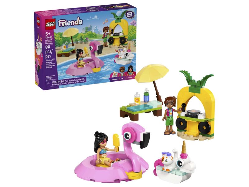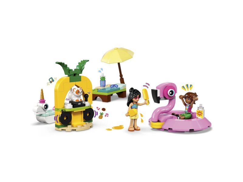 Конструктор детский LEGO Friends Вечеринка у бассейна с единорогом и фламинго 42658 – это забавная строительная игрушка для девочек и мальчиков с 2 мини-куклами, фигуркой кошки и множеством креативных аксессуаров. 2 игрушки для бассейна, которые можно собрать – дети развивают свои навыки конструирования, собирая поплавок с фламинго, в который помещаются 2 мини-куклы, поплавок с единорогом для кота Чурро и сцену у бассейна с шезлонгом и кабинкой диджея.