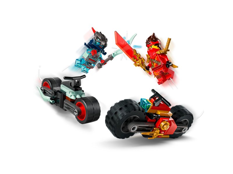 В остросюжетном боевом наборе для мотоциклистов представлены 2 мотоцикла-ниндзя с движущимися колесами: гоночный велосипед Кая, украшенный двумя кинжалами, и демонический велосипед злодейского разведчика-спектрального дракона.