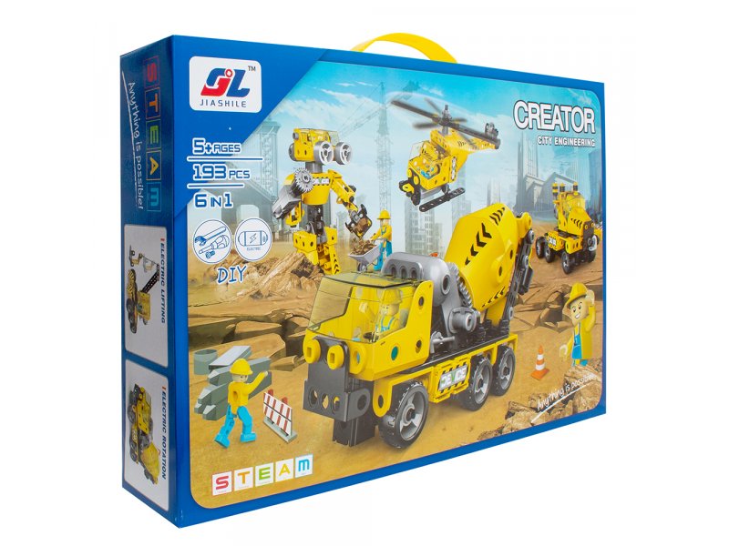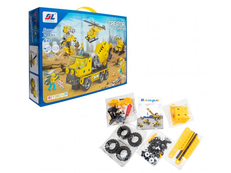Конструктор с тематикой «строительная техника». Комплект включает в действительности 200 составляющих набора (187 элементов конструктора + 6 доп. эл., отвёртка, гаечный ключ, плоскогубцы, 2 человечка и моторчик, который состоит из двух частей) + наклейки, инструкция. На коробке и 1-й странице инструкции - 193; на последней странице инструкции - 194. В инструкции показана сборка 6 моделей. За один раз может быть собрана только одна модель. У человечков двигаются руки, ноги, можно посадить, снять каску.