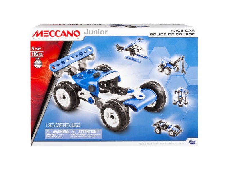 Конструктор из серии Meccano Junior для мальчиков 5 – 7 лет. Базовая модель этого яркого интересного набора – спортивный гоночный автомобиль, кроме того из этих же деталей можно собрать еще 4 вида различной техники.