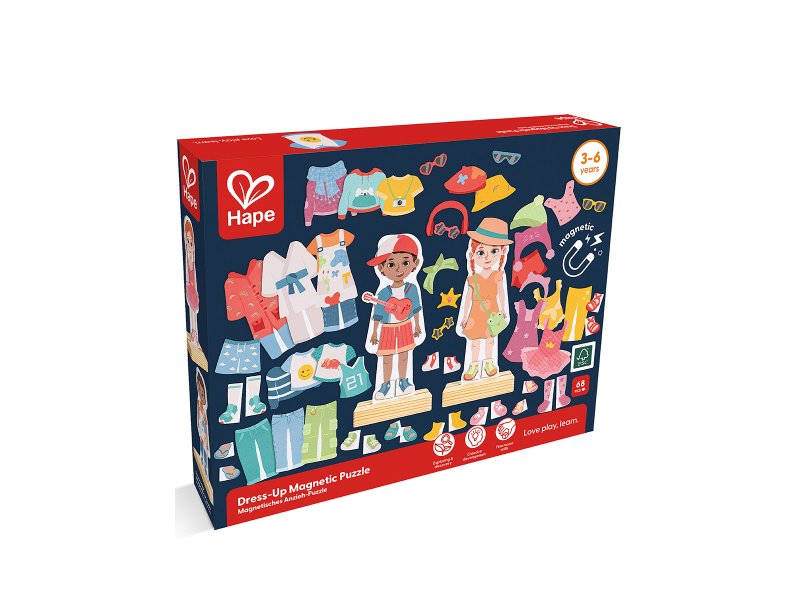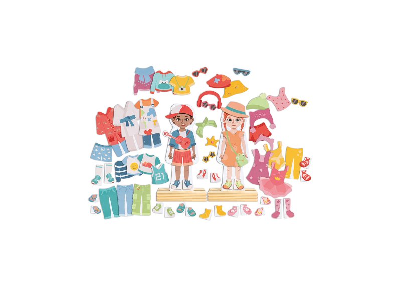 Магнитный конструктор для малышей "Меняй наряд" направлен на развитие логического мышления ребенка, внимания и цветового восприятия, его социализацию. Набор включает 2 фигурки в полный рост (мальчик и девочка), 2 деревянных подставки и 67 различных элементов одежды и обуви.