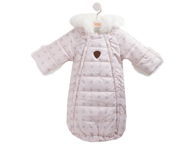 Теплый конверт с рукавами для самых маленьких от компании Bembi. Принт снежинки. Модель выполнена с капюшоном. Отделка мехом выполнена на капюшоне и рукавах. Застежка на две молнии спереди. Дополнительно имеется кнопки.