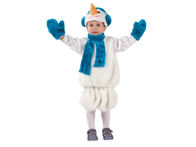 Костюм карнавальный Батик, Снеговик (мех). Какое же зимнее сказочное приключение без Снеговика? А карнавал как раз и является тем местом, где зимнее сказочное приключение становится явью, который не позволит Снеговику растаять, а наоборот сделает все, чтобы малыш в костюмчике Снеговика согревал его и радовал всех вокруг. Любой мальчик в костюмчике Снеговик будет располагать к себе внимание на любом детском празднике или спектакле. Костюм состоит из забавных и белоснежных объёмных шорт, объёмной безрукавки и ярким синим шарфом, маска в виде головы снеговика белого цвета и синего цвета варежки. Обязательный атрибут Снеговика - это нос-морковка на маске. Весь костюмчик выполнен из качественного искусственного меха
