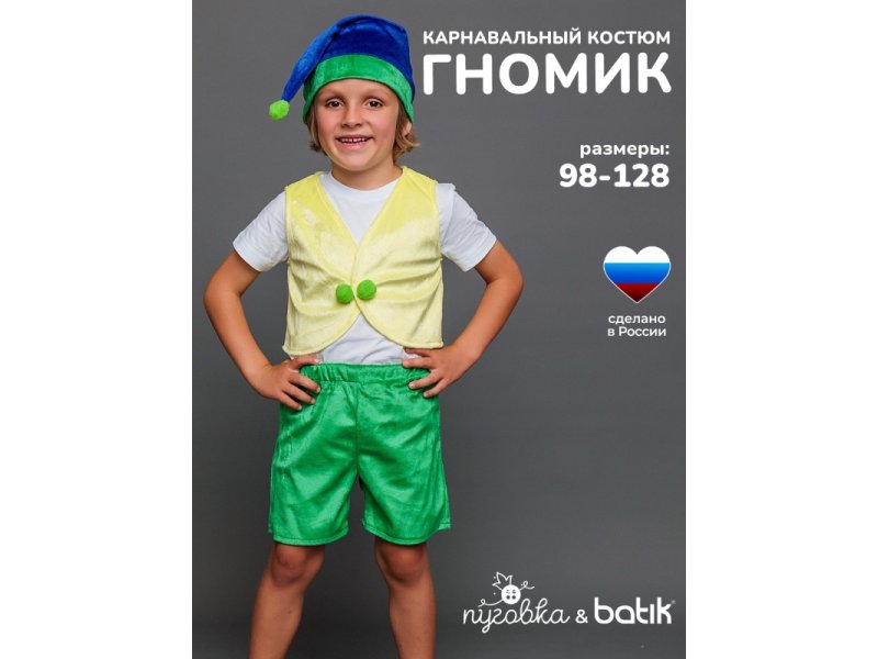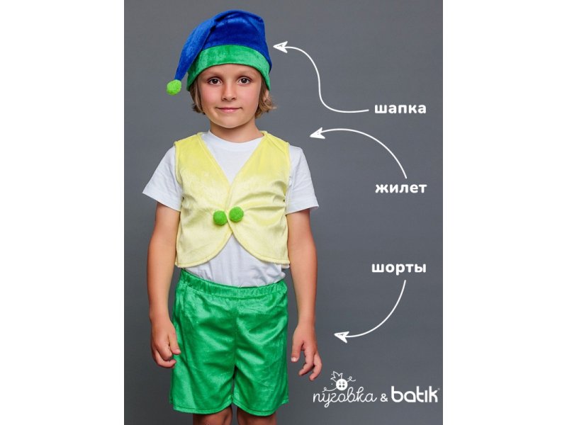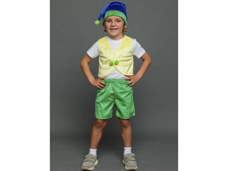 Костюм карнавальный Пуговка Гномик Тоша шорты, жилет, колпак