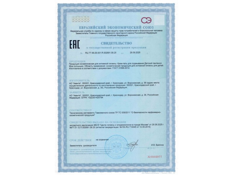 Крем-гель Мое солнышко для подмывания младенцев с пантенолом, 400 мл