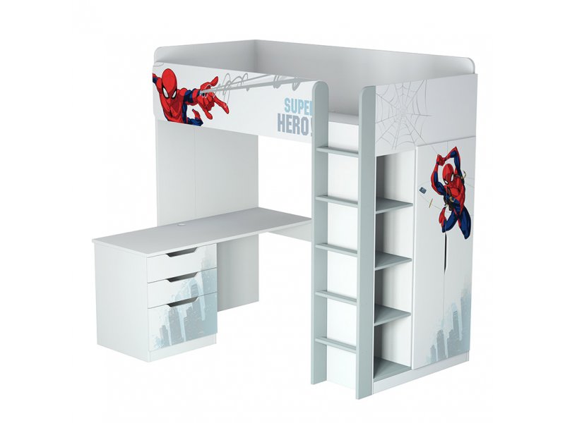 Кровать-чердак Polini Kids Marvel Человек-паук включает в себя сразу 5 предметов мебели: кровать для подростка, лестницу, письменный стол, шкаф, стеллаж. Продукция строго соответствует Европейским стандартам качества детской мебели.