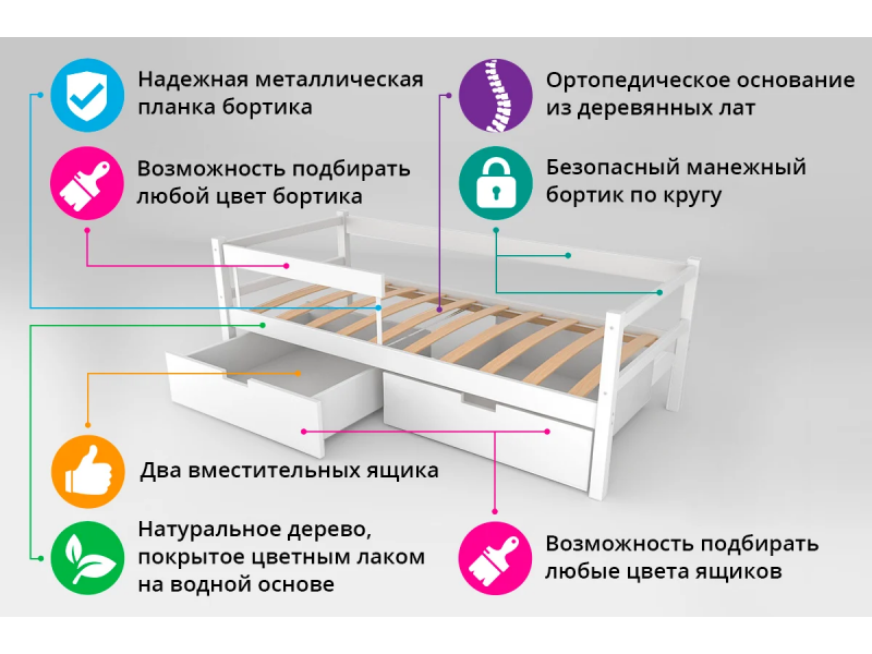 Изготовленная из экологически безопасного материала, кровать соответствует нормам ГОСТ. Под кроватью можно разместить несколько просторных ящиков, которые вы можете использовать для хранения постельного белья или же детских игрушек.