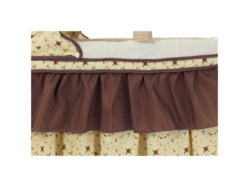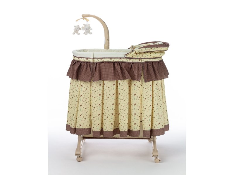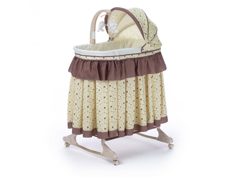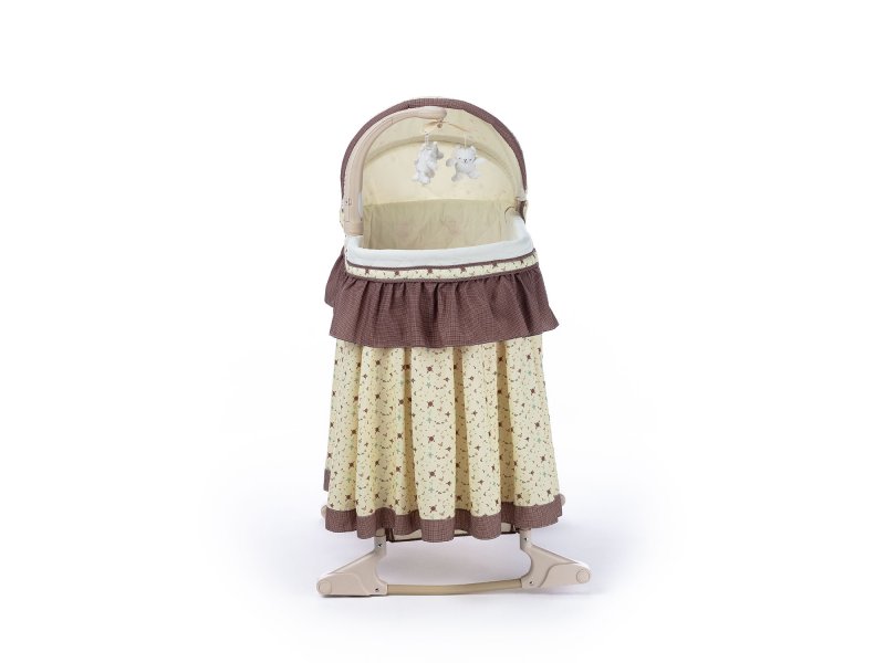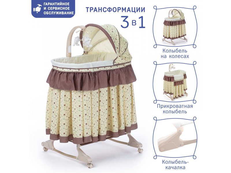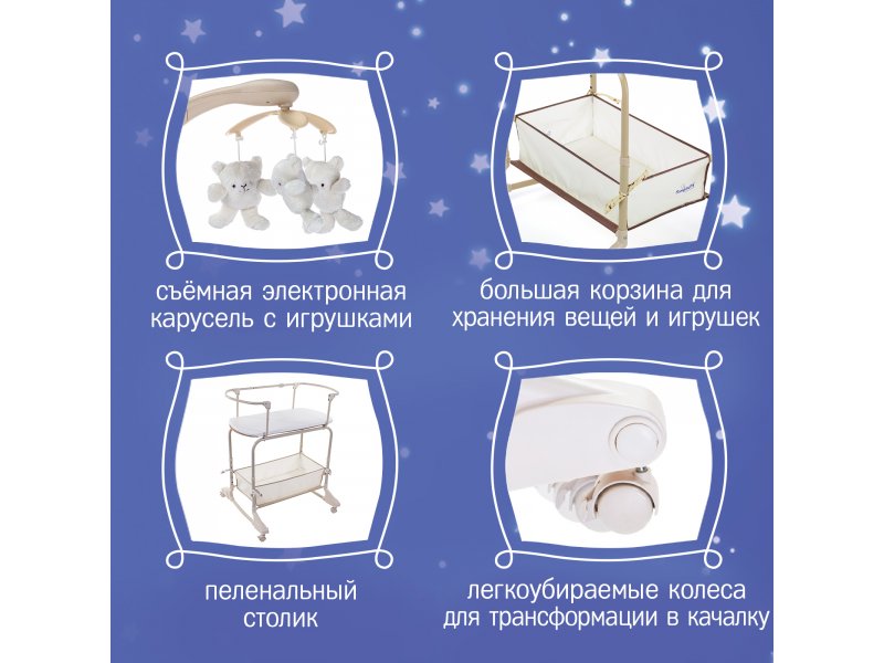 Основание ложа имеет 5 уровней регулировки высоты. Колыбель надежно фиксируется в неподвижном состоянии благодаря наличию колёсных стопоров (фиксаторов). Вибрационная система укачивания успокоит малыша, помогая ему заснуть. Съемный музыкальный мобиль со световыми и звуковыми эффектами и 3 подвесными милыми игрушками, которые увлекут днем, пока мама занимается домашними делами и помогут успокоить малыша ночью.