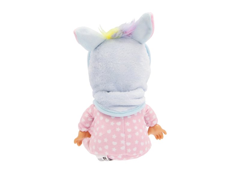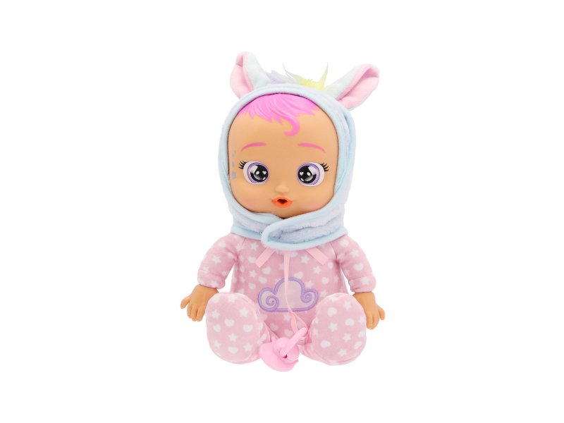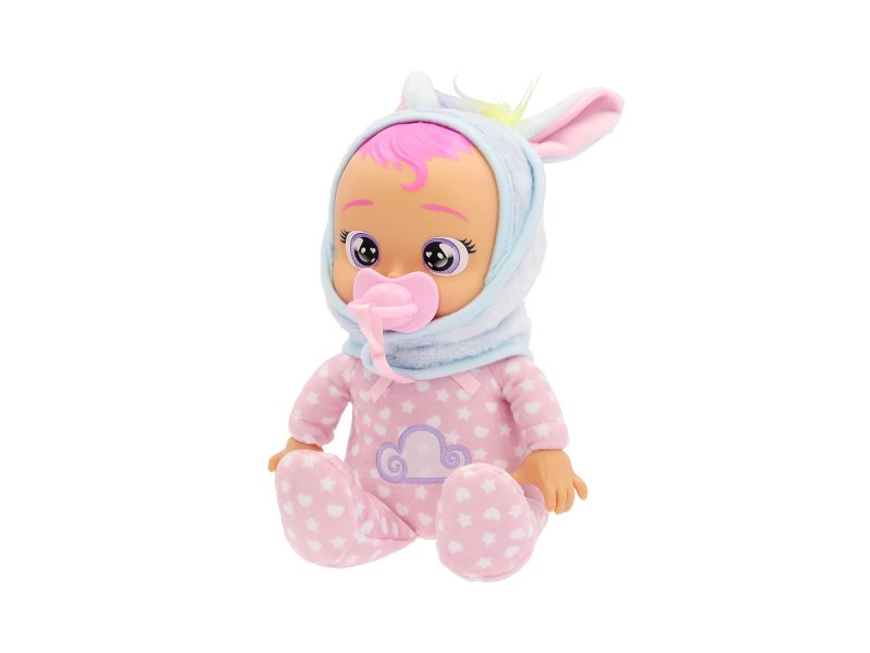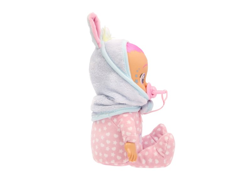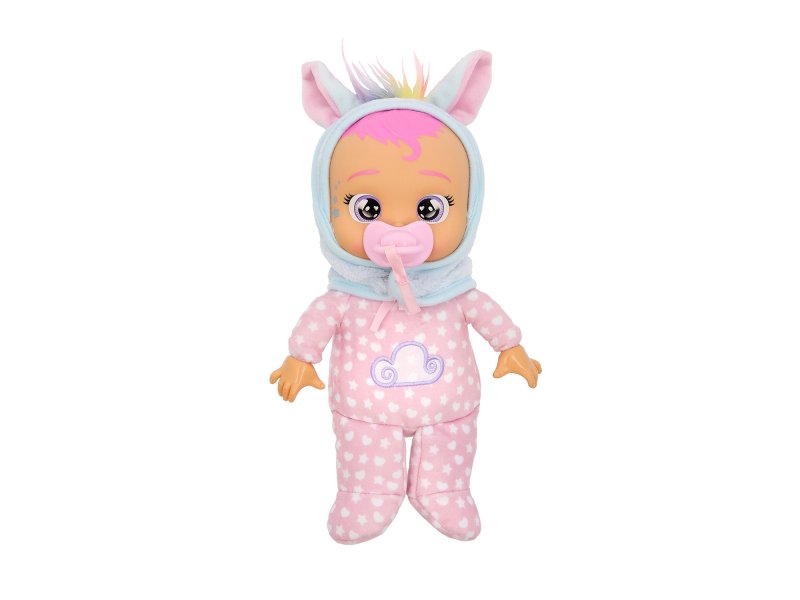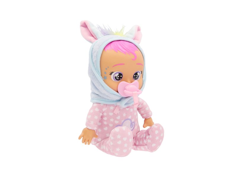 Кукла Дженна Малышка высотой 25 см с мягконабивным телом и пустышкой, прикрепленной к пижамке. Для того чтобы слезы вытекали из глаз при нажатии на голову, необходимо залить воду в специальный отсек на голове куклы и вынуть пустышку.