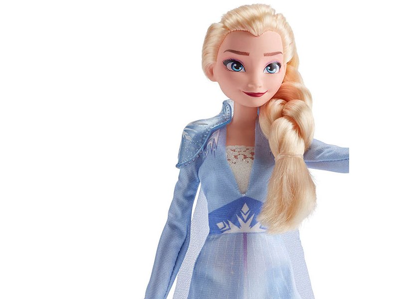 Принцесса Эльза с белыми, заплетенными в косу, прошитыми волосами выглядит сказочно и по-зимнему красиво. У нее большие голубые глаза и красные губа. Куколка одета в длинное небесно-голубое платье с кружевной вставкой на груди и блестящим снежным орнаментом на юбке. На плечах красивый ажурный воротник, на платье накинут белый прозрачный плащ, а на ножках белые высокие сапожки.