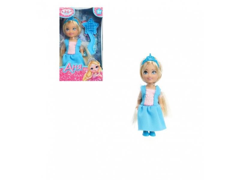 Очаровательная принцесса Аня одета в милое голубое с розовым платье и корону. Одежду и аксессуары легко снять и надеть. У Ани длинные красивые волосы, которые хозяйка куклы сможет заплетать в разные причёски. Детально проработанный дизайн игрушки вдохновит девочку на новые игровые сюжеты.