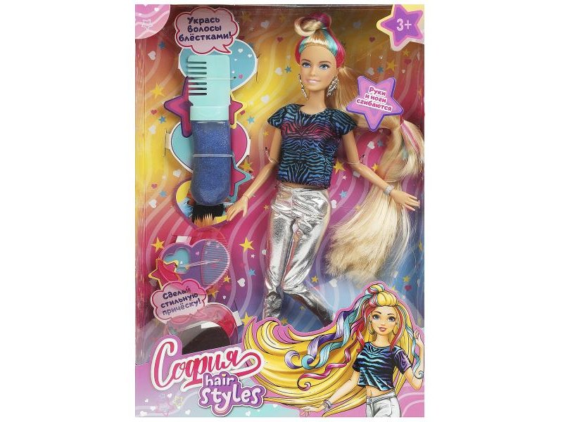 Суперстильная София одета в блестящие зауженные брючки и яркую футболку, образ дополняют крупные серьги и часы. Одежду и аксессуары легко снять и надеть. С такой модной куклой девочке будет интересно и весело играть: благодаря тому, что руки и ноги куклы подвижны, им можно придать любое положение. У Софии длинные волосы, которые хозяйка куклы сможет заплетать в разные причёски. Наличие дополнительных аксессуаров в наборе сделает игры с куклой более разнообразными и интересными.