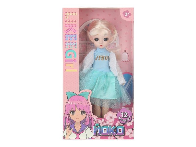 Очаровательная аниме-куколка Йоко станет лучшей подружкой вашей принцессы. У неё милое личико с красивыми глазками с длинными ресничками, которое не оставит равнодушной ни одну девочку. Куколка одета в голубое платье с короткими рукавами, воротничком-стойкой и пышной юбочкой и в блестящую серую кофточку. Одежда и обувь легко снимаются и надеваются. Руки и ноги Йоко очень подвижны, они имеют 12 точек артикуляции, поэтому им можно придать любое положение. У куклы длинные красивые светлые волосы, заплетённые в два хвоста. Девочка с удовольствием будет ухаживать за волосами своей аниме-подруги, создавая различные причёски.