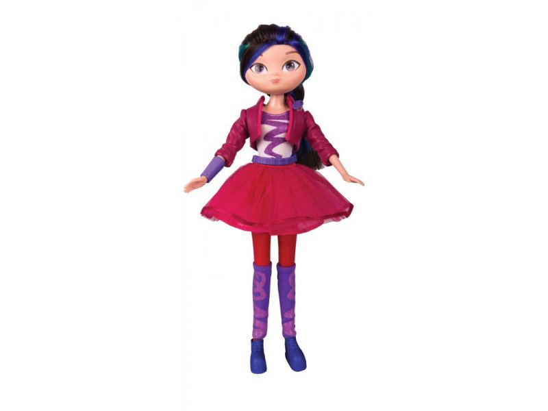 Стильная брюнетка с изумрудными и синими прядями в волосах покоряет девочек разного возраста своим fashion-нарядом. Пышная фатиновая красная юбка в тандеме с бордовой кожаной курткой создают образ немного дерзкой, но в то же время романтичной юной леди. Веселые лиловые гетры гармонично перекликаются с браслетом на руке и пояском на талии, выполненном в том же цвете.