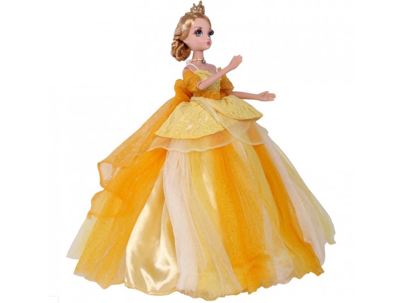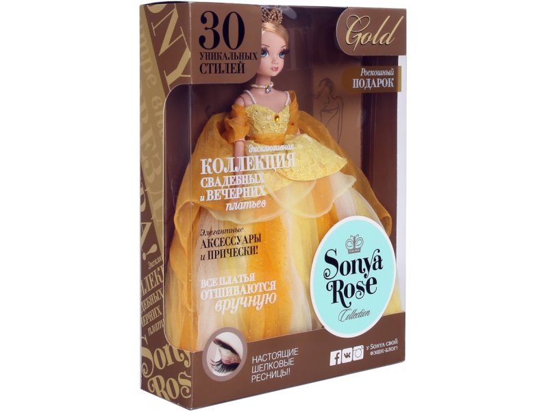 Sonya Rose — самая красивая и модная кукла! Сегодня она надела новое платье. Оно невероятно пышное: юбка выполнена из нескольких слоев легкого материала. Сзади платье украшает огромный бант. Материал струится и переливается, играет на свете так, что кажется, кукла сама излучает солнечный свет. Изюминкой наряда служит брошь тёмно-жёлтого цвета. Шикарный образ дополняет ожерелье с кулоном под цвет голубых глаз красавицы. Золотистые локоны волос забраны в сложную прическу. Голову украшает позолоченная корона.