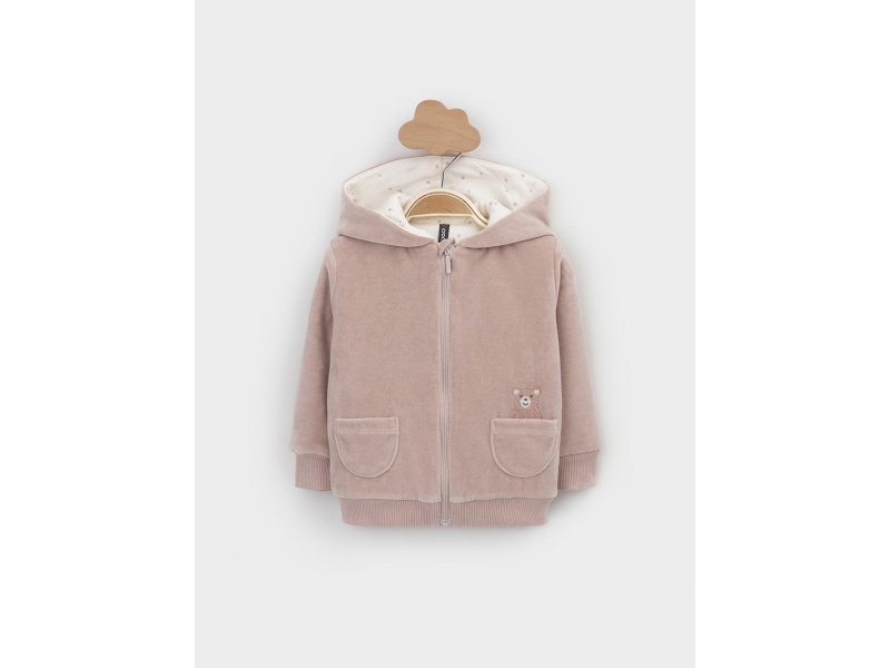 Внутри синтепон и подклад из натурального хлопка. Изделие застёгивается на молнию и имеет капюшон. На рукавах мягкие манжеты, внизу - эластичный пояс. Спереди два накладных кармана и украшение в виде вышивки.