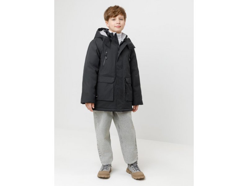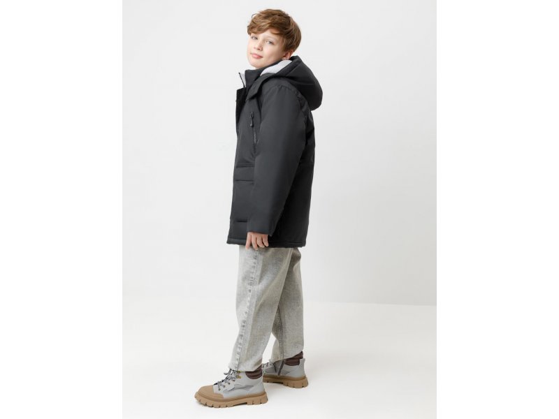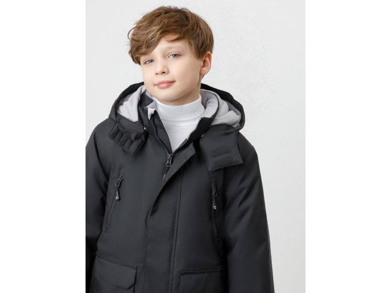 Зимняя куртка для мальчика с утеплителем SEE®: 250 г/м2. Выполнена из мембранной ткани с дополнительной тефлоновой обработкой, которая предохраняет изделие от загрязнений и отталкивает влагу. Подклад выполнен из 100% полиэстера Tricot. Куртка застёгивается на молнию и внешнюю планку с магнитными кнопками, предусмотрена защита подбородка. Съёмный капюшон на кнопках и липучках имеет эластичную утяжку со стопперами. На рукавах внутренние эластичные манжеты. Два накладных кармана с клапанами по бокам и два кармана с молниями на груди. По талии эластичная утяжка со стопперами. Во всех изделиях верхнего ассортимента для безопасности ребёнка предусмотрены светоотражающие элементы. Состав: верх: 80% нейлон, 20% полиуретан; подклад: 100% полиэстер; Утеплитель: 100% полиэстер. Температурный ркежим: от -5º С до -25º С