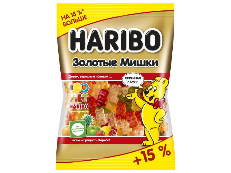 Любимый всеми жевательный мармелад Haribo в форме золотых мишек. Изготавливается путем выпаривания смеси из натуральных ягод и фруктов с сахаром, патокой, желатином, красителями и ароматизаторами.