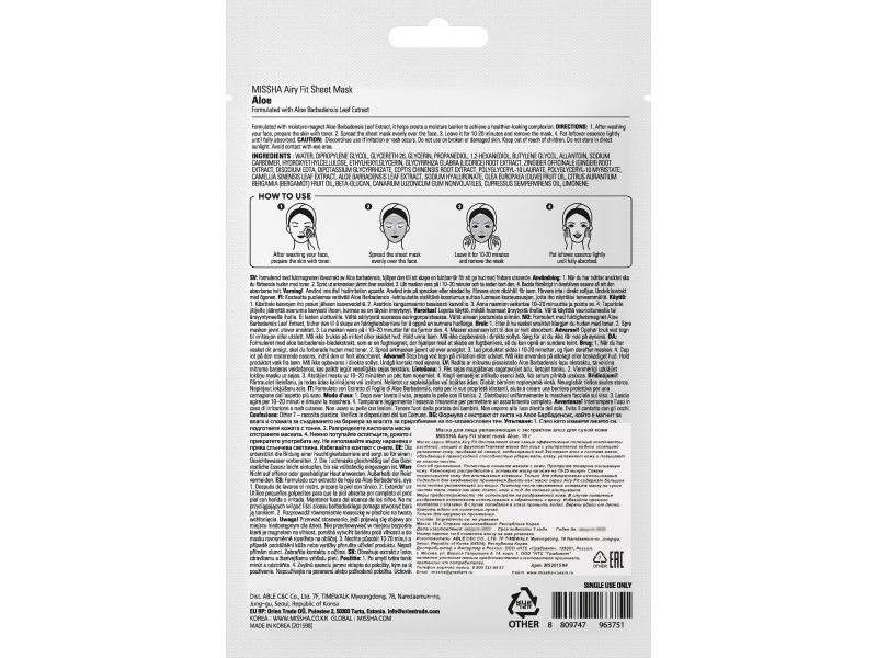 Маска для лица Missha увлажняющая с экстрактом алоэ для сухой кожи 19 г