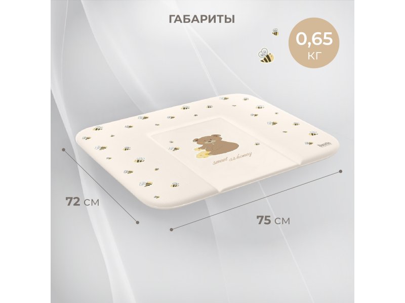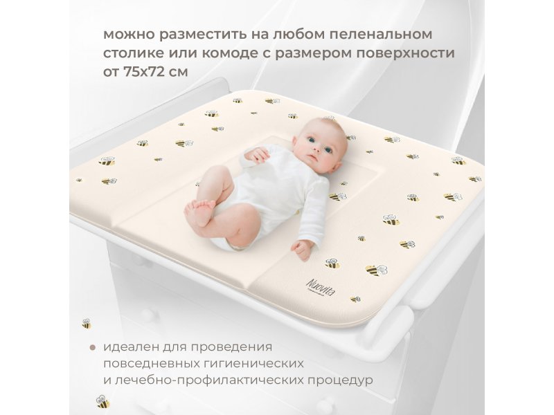 Мягкая упругая поверхность позволяет с комфортом поместить малыша для переодевания и выполнения гигиенических процедур. Объемные сгибающиеся бортики помогут защитить нежную кожу от травм. Изделие имеет размер — 72х75х2 см.