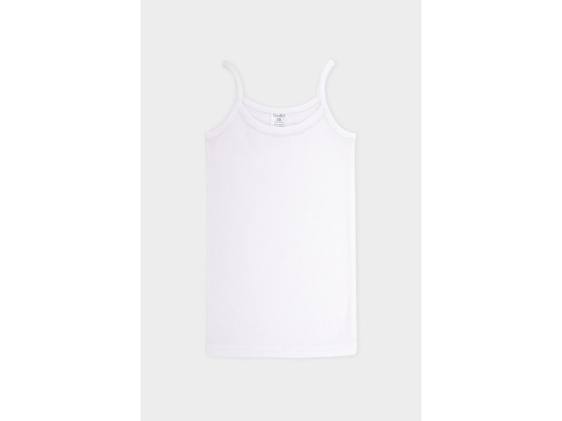 Майка на бретелях для девочки из трикотажного хлопка. Горловина украшена декоративной мережкой. На полочке бантик. Состав: 100% хлопок. Ткань: Рибана