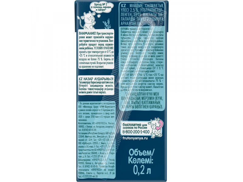 Молоко Фрутоняня ультрапастеризованное 2,5% 0,2 л