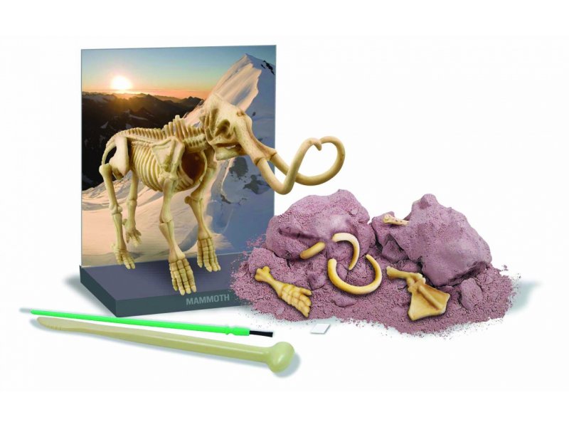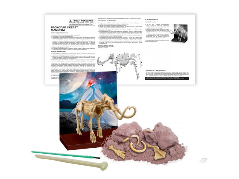 Набор 4M Раскопай скелет, Мамонт прекрасный подарок ребенку! История нашей планеты насчитывает более 4 миллиардов лет. За это время жизнь на Земле многократно менялась, приводя к стремительному развитию одних видов животных и печальной гибели других. Самые известные существа, загадочно исчезнувшие с нашей планеты, - это мамонты. Все, что мы сегодня знаем о древних гигантах, – заслуга палеонтологов. Они старательно отыскивают окаменелые следы прошлого, чтобы разгадать величайшие тайны нашей планеты. Набор включает специальную подставку с красочным фоном. Длина модели в собранном виде: 21 см. Откройте для ребенка мир удивительных палеонтологических открытий с набор от 4М! Предложите ему самостоятельно откопать кости давно исчезнувшего мамонта и собрать весь скелет воедино. Как работать с набором? Это настоящее приключение для юных исследователей! В коробке ребенок обнаружит брикет из красно-бурого гипса, внутри которого спрятаны кости мамонта. Работая скребком и кисточкой, маленький археолог проведет кропотливые раскопки. А затем с помощью мягкого воска соединит скелет. Готовый экспонат, добытый собственным трудом, он гордо будет демонстрировать друзьям и родственникам. Набор "Скелет мамонта" - это познавательный и увлекательный досуг, который к тому же развивает мелкую моторику, воображение, трудолюбие и аккуратность. Благодаря таким экспериментам ваш ребенок расширит кругозор и проникнется интересом к естественным наукам. Раскопки могут занять несколько дней и потребуют от юного исследователя терпения и целеустремленности. В награду за свои старания ребенок получит море позитивных эмоций и чувство самоудовлетворения. Меры предосторожности Ознакомьтесь с инструкцией перед началом работы. Раскопки и сборку скелета рекомендуется проводить под контролем взрослых. Пыль, появляющаяся в результате раскопок, может вызвать раздражение глаз, носа и горла. Желательно работать в фартуке, маске и очках. В случае попадания пыли в глаза, промойте их водой. Если неприятные ощущения не пройдут, обратитесь к врачу. В комплекте содержатся мелкие детали, поэтому набор не предназначен для детей младше 3 лет. Не высыпайте остатки гипса в раковину и ванну, чтобы избежать засорения канализации.
