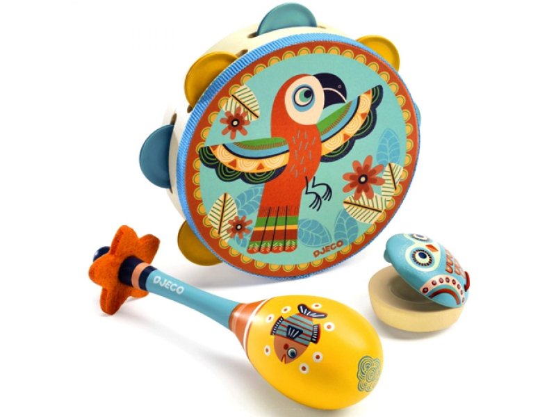 Набор музыкальных инструментов от французского производителя Djeco – великолепный набор, состоящий из маракаса, кастаньет и бубна, с помощью которого ребенок будет развивать свои творческие и музыкальные способности. Все инструменты в наборе очень яркие и красочные. На их корпусе изображены забавные животные, а также различные орнаменты и узоры. На этих инструментах можно играть как в одиночку, так и в компании, создав свой собственный импровизированный мини-оркестр! Игра на детских музыкальных инструментах прекрасно развивает музыкальный слух, творческие способности малыша, координацию движений и детскую моторику. Набор изготовлен из безопасных высококачественных материалов. Продается в яркой подарочной упаковке. Французская компания Джеко производит развивающие игрушки и игры для детей, а также наборы для творчества и детали интерьера детской комнаты. Все товары Джеко отличаются высочайшим качеством, необычной идеей исполнения.