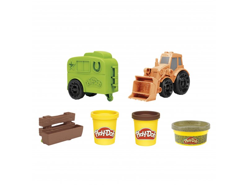 Набор для лепки Hasbro Play-Doh Wheels Фермерский трактор непременно понравится ребенку! Отправьтесь на ферму прямо на тракторе Плей-До! С помощью прицепа трактора малыш сможет слепить лошадок и поселить их на ферме. Трактор оснащен рабочим ковшом, в котором есть форма для лепки тюков сена. Корыто позволит сделать фрукты и початки кукурузы для лошадок. Три баночки массы для лепки подходящих цветов помогут малышу воссоздать картину сельской жизни. Идеальный подарок для юных фермеров, которые обожают лошадей и рабочую технику!