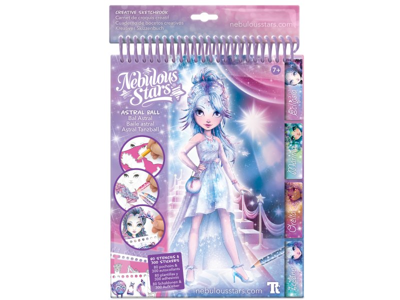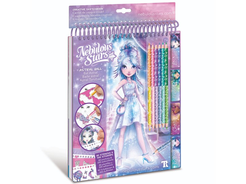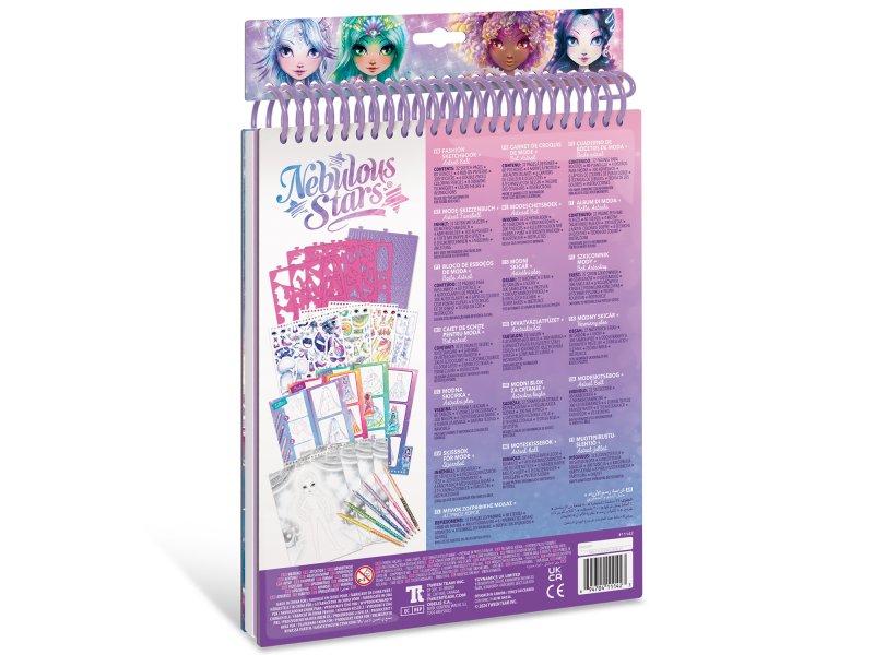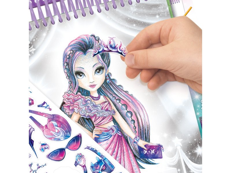 Комплектация: 32 страницы для создания модных эскизов, 80 трафаретов, 4 рисунка для втирания, 300 наклеек и 6 двухсторонних цветных карандашей, теория цвета, инструкция.