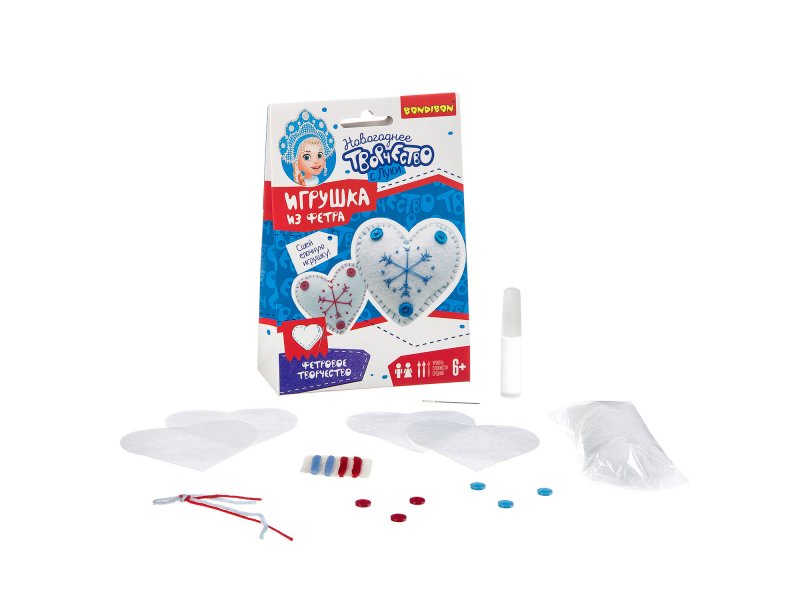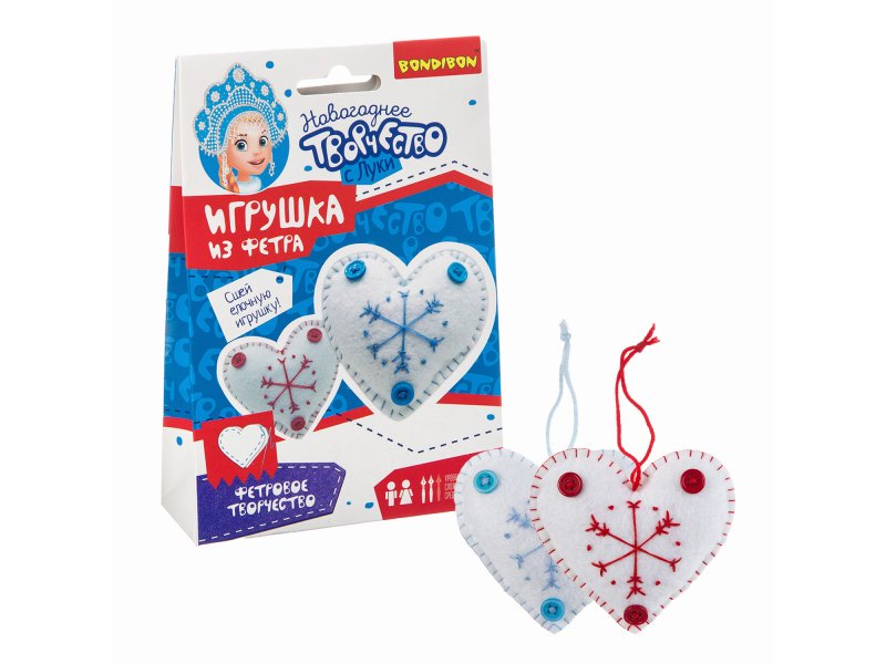 Красивые украшения на елку своими руками! Шитье из фетра с набором для творчества ЕЛОЧНЫЕ ИГРУШКИ ИЗ ФЕТРА СВОИМИ РУКАМИ. СЕРДЕЧКИ серии Новогоднее творчество с Луки от Bondibon – это легко и интересно! Соедините фетровые заготовки, следуя инструкции. Вставьте внутрь наполнитель и декорируйте сердечки. Немого усердия, и в результате у Вас получатся две оригинальные подвески, которые будут чудесно смотреться на новогодней елочке! А еще такую поделку можно отнести на конкурс в детский сад и школу. Фетровое творчество поможет овладеть навыками шитья, разовьет мелкую моторику, аккуратность, внимательность и чувство вкуса. В набор входят: заготовки для игрушек, игла, нити, клей, наполнитель. Возраст 6+ Набор для рукоделия ЕЛОЧНЫЕ ИГРУШКИ ИЗ ФЕТРА СВОИМИ РУКАМИ. СЕРДЕЧКИ от Бондибон выбирают в качестве подарка для девочек под елку дома, а также на новогоднем утреннике в детском саду и начальной школе. Собери всю серию фетровых украшений на елку!
