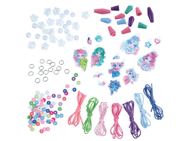 Комплектация: 14 акриловых подвесок с забавными принтами, 98 стильных бусин, 14 металлических колец для сборки, 7 шелковых шнуров разных цветов, лист с блестящими стразами, инструкция.