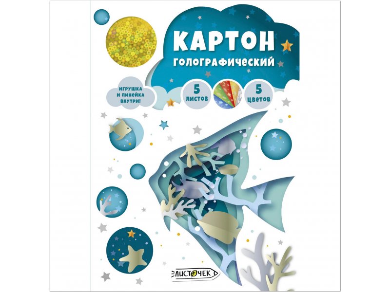 Набор цветного голографичекого картона от Эксмо. предназначен для детского творчества.Картон легко режется ножницами, сгибается и клеится. Внутренний блок состоит из 5 листов формата А4 (205х290 мм) и 2 цветов:золото и серебро.